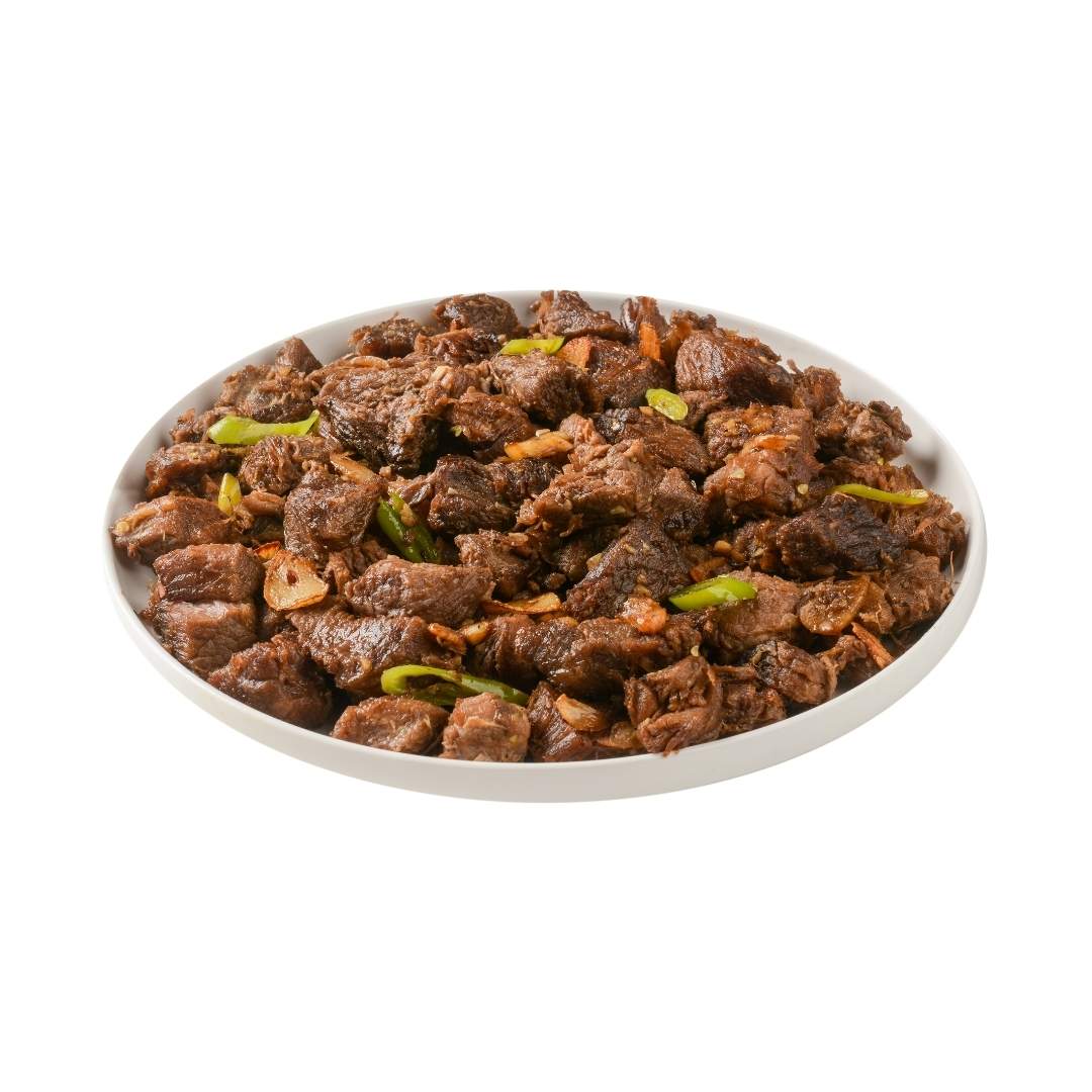 Spicy and savory tender beef cubes in a garlicky sauce with mushrooms