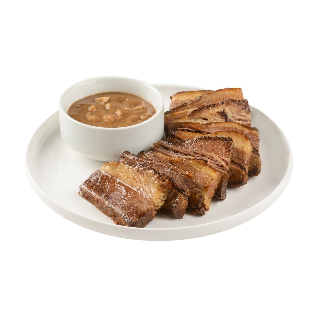 Slow-cooked, smoky roast beef marinated with herbs and spices, served with savory mushroom gravy